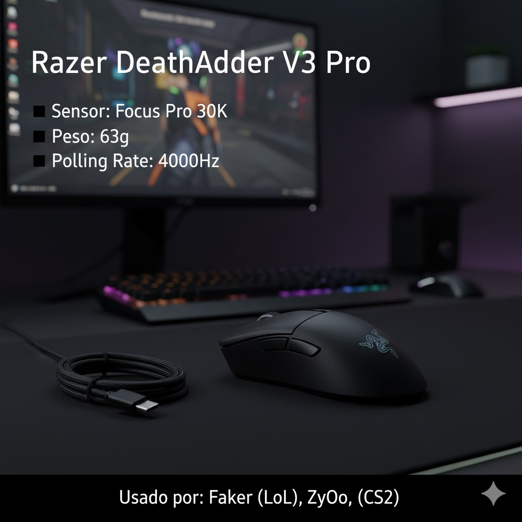 Por que ele é ótimo: O DeathAdder V3 Pro mantém o formato ergonômico clássico que tantos amam, mas com melhorias significativas. Seu sensor Focus Pro 30K é incrivelmente preciso, e o polling rate de 4000Hz (com o dongle opcional) oferece uma experiência de rastreamento sem igual. É perfeito para quem busca conforto e performance de ponta.