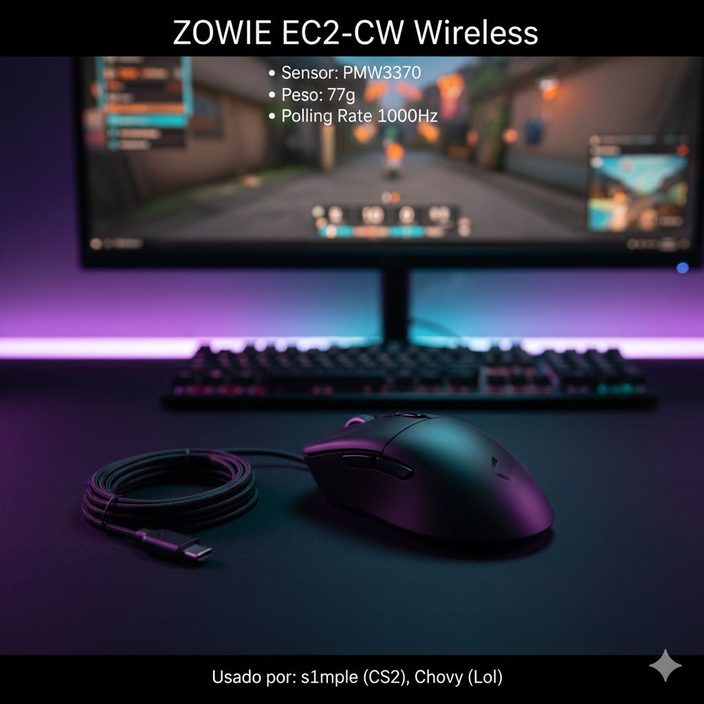 Por que ele é ótimo: A série EC da ZOWIE é lendária por sua forma ergonômica e desempenho sólido em jogos competitivos. O EC2-CW traz a liberdade do wireless sem comprometer a confiabilidade. Embora não seja o mais leve, sua forma otimizada para pegada tipo palm e claw, aliada ao sensor PMW3370, oferece uma experiência de rastreamento consistente e sem jitter. É a escolha de muitos que valorizam a simplicidade e o desempenho bruto.